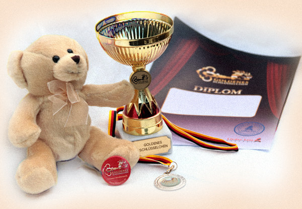 Закажите дополнительно комплект оригинальных призов. Один кубок, распечатанный диплом для театра, а так же фирменную медаль, значок и сувенир-талисман (берлинский мишка) конкурса для каждого конкурсанта или педагога по почте за дополнительную плату в размере: